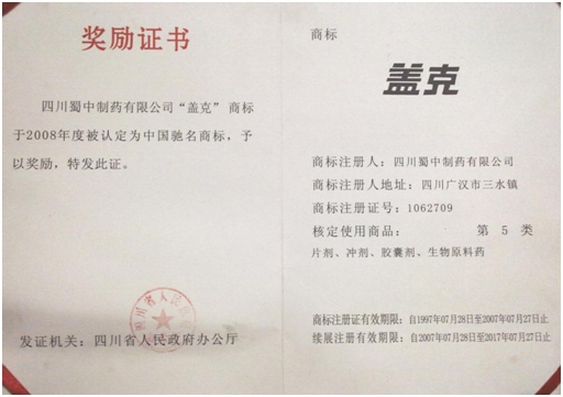 公司高度重视品牌战略,依法注册了“盖克”、“蜀中”、“三星堆”、“阿莫锋”、“益善源”、“蓉通”、“pg夺宝赏金女王”等108件注册商标,1999年“盖克”、2003年“蜀中”、2007年“三星堆”被认定为德阳市知名商标,2001年“盖克”、2004年“蜀中”被认定为四川省著名商标, 2008年“盖克”商标被国家工商行政管理总局认定为“中国驰名商标”。2017年3月,公司盖克牌、pg夺宝赏金女王牌阿莫西林胶囊和多酶片被四川省人民政府授予四川名牌产品称号。2016年,公司实现营业收入66373万元,利税7600万元;2017年,公司实现营业收入75045万元,利税7572万元。公司2017年被命名为德阳市第七批院士专家工作站,2016-2018连续三年被德阳市人民政府确定为重点龙头企业。
